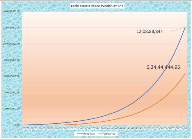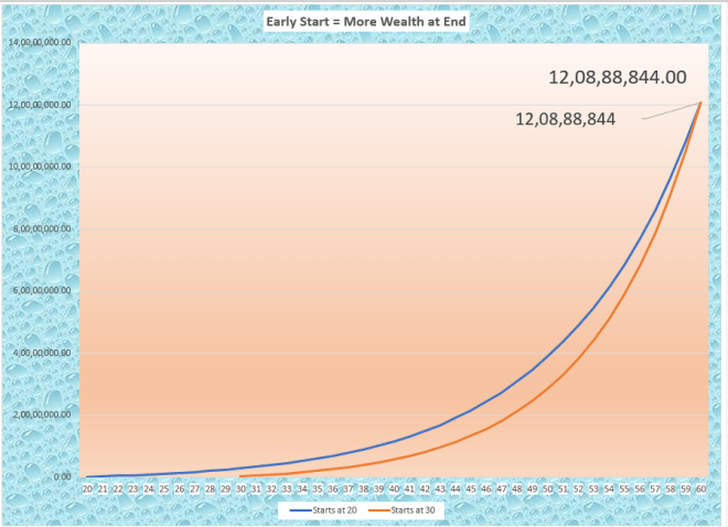 An often repeated mantra is that if you don’t start saving early, you end up losing tremendously. You cannot argue with a statement like that , especially when it’s backed by evidence of the difference in returns if you start at 20 or start at 30.
