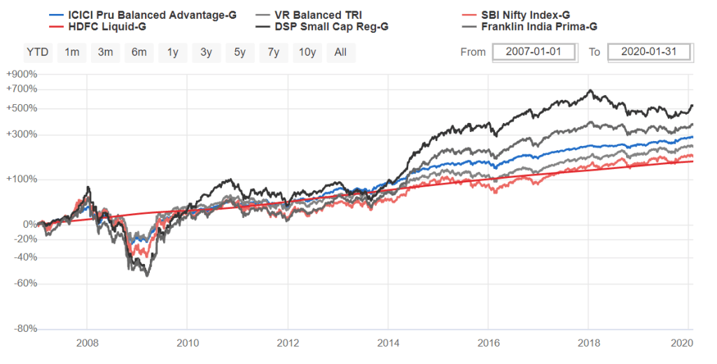 Look at the comparative chart (Source: Valueresearch) comparing Large Cap Index Fund, Mid Cap & Small Cap active funds versus a simple Liquid Fund and ICICI Pru Balanced Advantage which is a Asset Allocation Hybrid Fund.