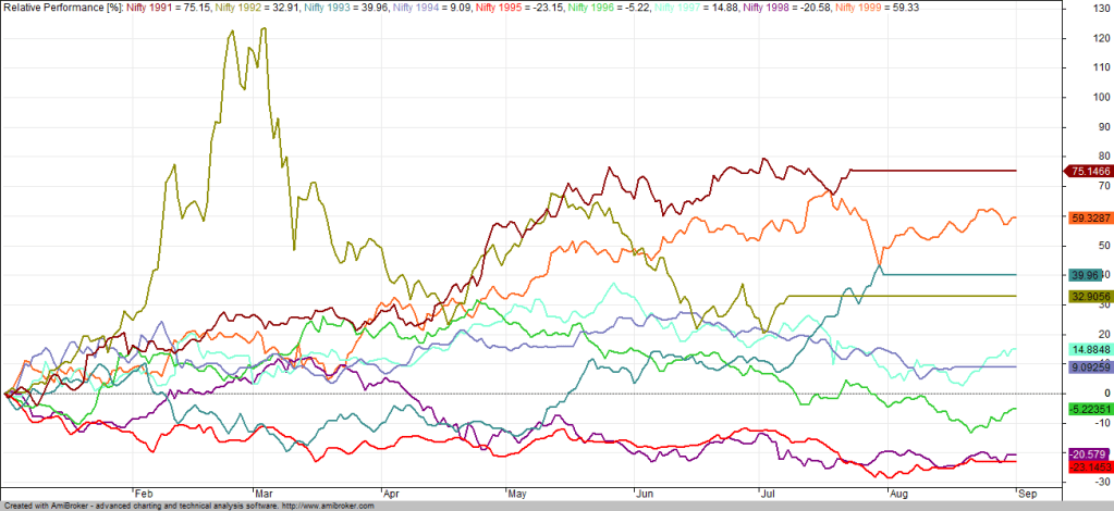 Let’s start by looking at the yearly performance of the 3 funds he managed vs the Sensex returns. Do note that while Mutual Fund returns are Total Returns, I am using non Total Returns of Sensex since Total Returns data doesn’t go as long back as the 90’s