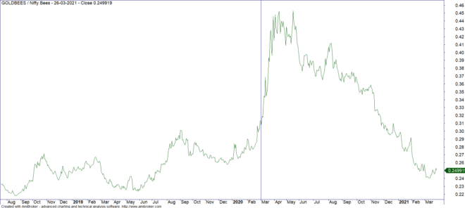 Ratio Plot of Gold Bees vs Nifty Bees seems to suggest no such move for now. I have marked a vertical line to show where this ratio was at the end of February 2020