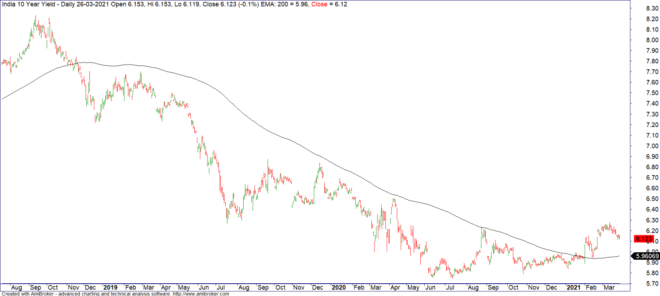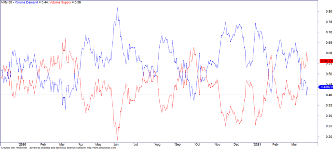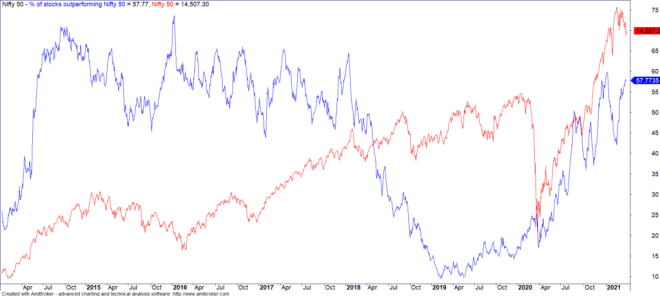 This bull market has been such that for months now, Nifty had not broken the previous month’s low (even intra-day) since October 2020. This was broken last week when February’s low was finally taken out. Not much of a negative signal though it does show that the trend is not as strong as it was in the last few months.