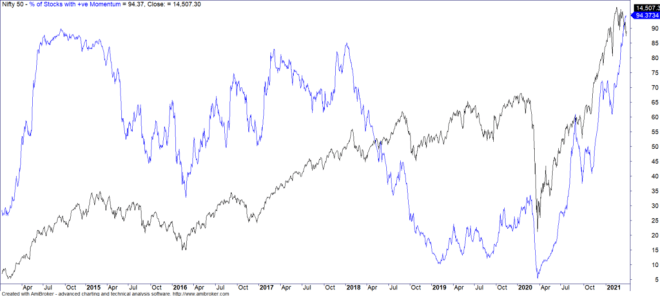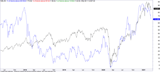 The black line represents the 200 day moving average. While it broke at the end of February 2020, today we are way above it. While this doesn’t mean that the markets cannot fall, the probability of markets becoming bearish big time from here is rare. Bad things generally happen below the 200 day EMA though as usual, there are exceptions to the rule. In January 2008, Nifty 50 was trading 31% above its 200 day EMA when the fall started and within a couple of weeks we had a drawdown of 30% from the peak’s. Today, Nifty is 15% above its 200 day EMA (it was 30% in January of this year)