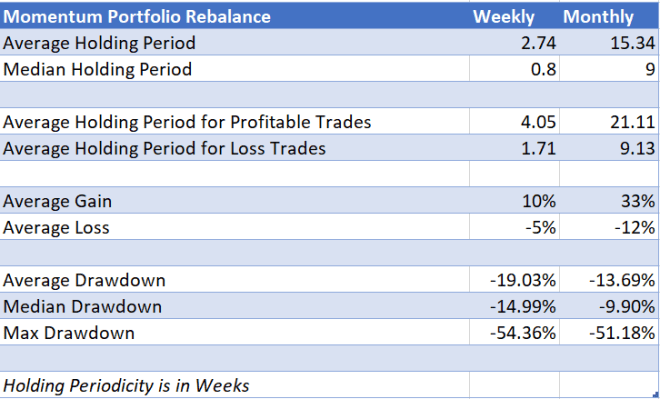 Weekly rebalancing when done with the same exit criteria as monthly has 80% more transactions. While you can reduce the transactions by having a larger rank exclusion (say instead of saying I will exit a stock once it goes below rank 50, changing it to 100 will provide for lower transactions), the constant need to check is in my opinion a hassle especially as the size of the portfolio gets larger.