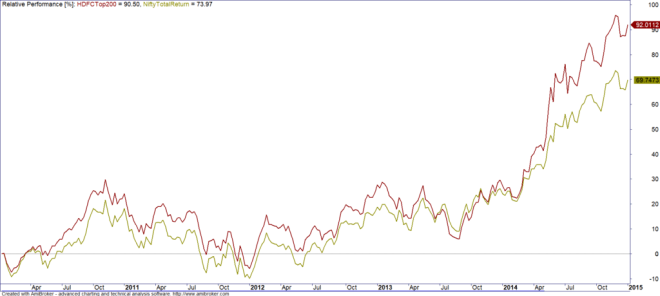 But here is the thing – what if you looked at the same data in 2015 (5 years comparison vs Nifty Total Returns). To compare, I shall use HDFC Top 200 fund – the fund that is no more in existence today but the prima donna for HDFC for a really long time and one Prashant has been managing