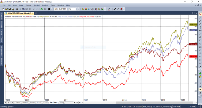 Suddenly, Nifty 50 doesn’t look so bad and Nifty Mid Cap isn’t a winner, let alone by a distance as could be seen in the first chart.