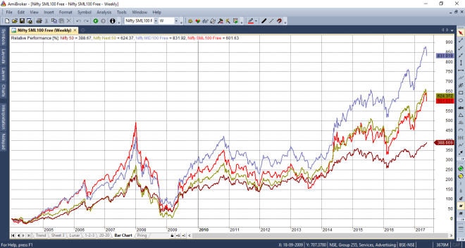 Starting from 2004, we can observe that the best performance has been delivered by Nifty Midcap 100 Index. Worst performance is by Nifty 50. But this picture suffers the starting point bias, what if we started at the peak of 2008?