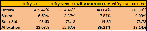 But the above model may not be suitable for someone who is starting of today and is saving for the very long term, for example Retirement. The aggressive model is currently at  30 : 70 in favor of debt and while this in a way signifies that there is Risk of a draw-down / lower returns going forward, this may not be a big issue for a investor who has saved very little, but wants to deploy small amounts regularly over time.